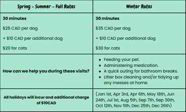 We feed your pet and take them out for bathroom breaks, administer their medication, or clean up any messes made at home.